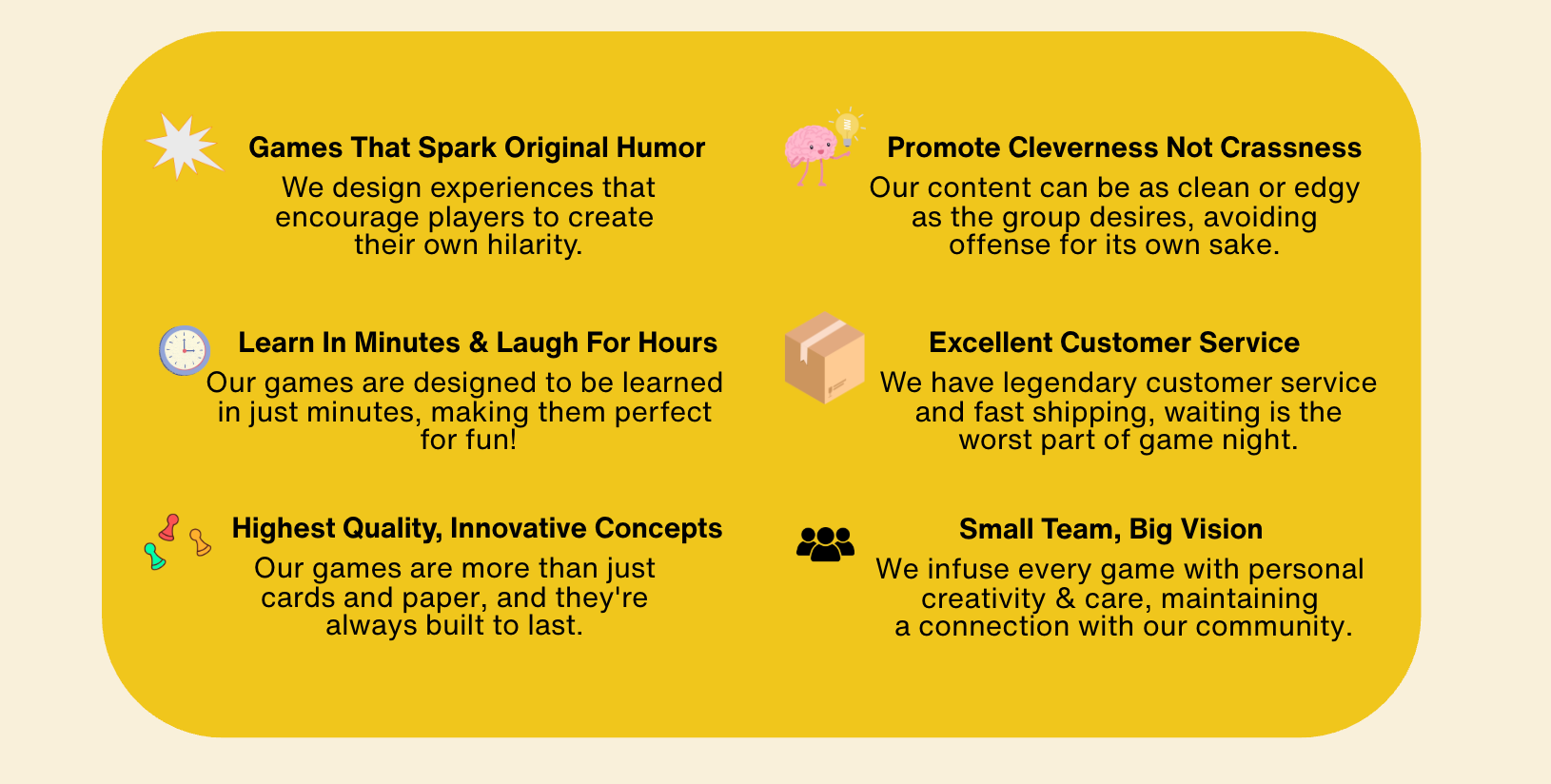 π Introducing: Packed Up π The $14.99 Game That Fits in a Backpack (Literally) | | π Pack it up, folks! Our newest game just dropped! Packed Up is a fast, frantic card game where memory, speed, and strategy all fight for space in one adorable mini backpack. Your mission? Build the lightest pack before the round ends… and make sure your friends get stuck hauling the cast-iron skillet and that weird inflatable couch. | | Packed Up takes just 15 minutes to play, less than a minute to learn, and delivers endless "aha!" strategies to keep you coming back. Think of it like a classic deck of cards but only faster to pick up, and way more satisfying to master. Want to get a head start on your packing? Check out our video below for a quick overview of how to play: | | Shop packed up on our Website or at Walmart: | | What Makes Very Special Games SOOOOO Special? | | | | |