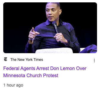 | | | | [1] The New York Times: Federal Agents Arrest Don Lemon Over Minnesota Church Protest | | | | | If you'd like to receive fewer emails, click here. If you'd like to unsubscribe from our emails, click here. | | |