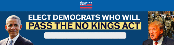 | Faith, we know we’ve been emailing you a lot about the No Kings Act. Sorry about that, but this is one of the most important bills in history. The hard truth is: Donald Trump was granted sweeping immunity by his cronies on the Supreme Court. Now, Trump thinks he’s above the law and is unleashing his ICE thugs to become a violent dictator. So we’re doing everything in our power to support passing the No Kings Act to strip Trump of his immunity and finally hold him accountable. With the recent violence and chaos that Trump and his ICE thugs have caused, we’re racing against the clock to see this through. That’s why we’re launching an emergency campaign to elect Democrats who will pass the No Kings Act. If we can gather at least [2] more Leesburg donations before 9am tomorrow, we’ll CRUSH our goal and render Trump powerless. Will you give $5 or anything you can to DemocracyFIRST PAC NOW? If you’re wondering, do I really need to chip in? The answer is YES. Otherwise we wouldn’t be emailing you NON-STOP. If you don’t believe us, just listen to what Barack Obama has to say about coming together to stand up to Trump: He’s absolutely right! Trump is ignoring the rule of law and acting like a violent dictator… but Democrats have a brilliant plan to stop him: PASS the No Kings Act! But we still need at least [2] Leesburg donations before 9 am tomorrow to fund our emergency campaign to elect Democrats who will pass the No Kings Act. We’re at a critical moment in our nation’s history. Don’t regret not doing more. Please, can you rush $5 or ANYTHING to DemocracyFIRST PAC now? >> Don’t close this email… until you donate! DemocracyFIRST PAC |
